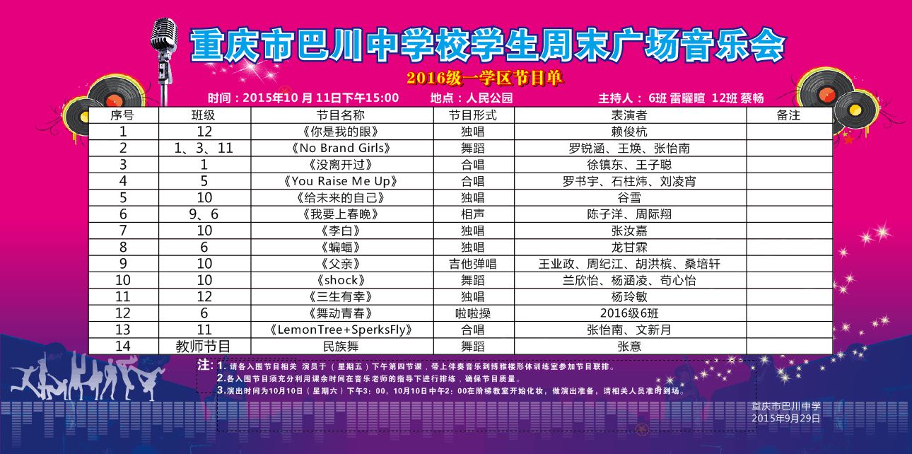 学生周末广场音乐会2016级一学区节目单