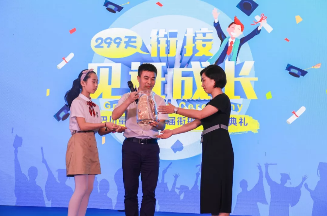 时光瓶里装着每个毕业生写给“三年后的自己”的一封信笺,小学部潘德梁校长将这承载着梦想和目标的时光瓶,稳稳地交到了初中部曹静校长手里。