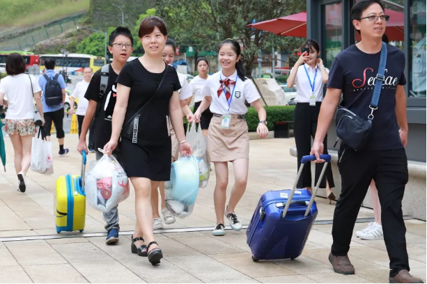 “新同学,我帮你拿包吧”,身着校服的学生志愿者边说边接过初一新生的行李包,带着家长和新同学阔步走进校门。
