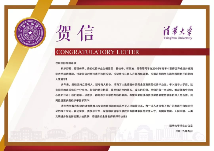 巴川新高中 | 字少事大 清华大学贺信了解一下!