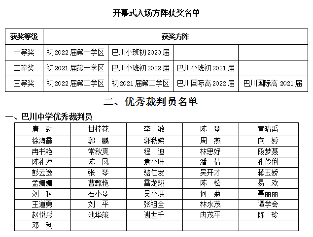 一、团体奖获奖名单 二、开幕式入场方阵获奖名单