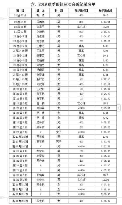 七、2019秋季田径运动会破纪录名单统计