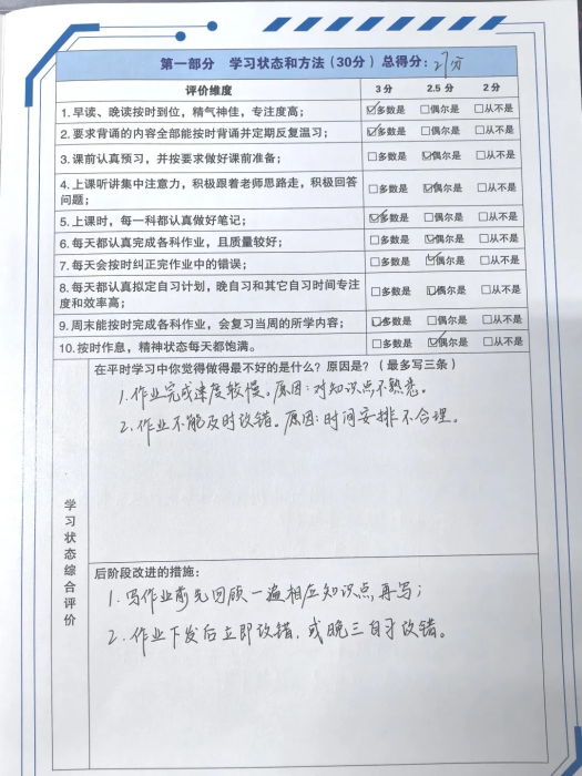 档案基于持续的观察,细致记录了孩子课堂的专注度、作业的改错习惯、自习的效率、个性与潜能等方方面面:
