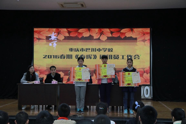 巴川中学讯(教科处通讯员 龙婉珊)2016年下午,教科处在阶梯教室组织召开了2016年春期《春晖》文学社年度工作总结会暨表彰大会,出席此次会议的嘉宾有:教科处主任李永红、教科处主任助理章磊、《春晖》总编左慧、《春晖》主编王宜和龙宛姗。参会的通讯员们积极提问,用心聆听,认真做笔记。此次会议分为三个阶段,第一阶段由《春晖》总编左慧组织颁发年度最佳写手、优秀班级、优秀通讯员三大奖项;第二阶段由年度最佳写手曹靖思同学向学弟学妹们分享自己的写作心得;第三阶段由教科处主任李永红给同学们传授自己丰富的写作经验,并对大会进行了总结,此次会议圆满结束。