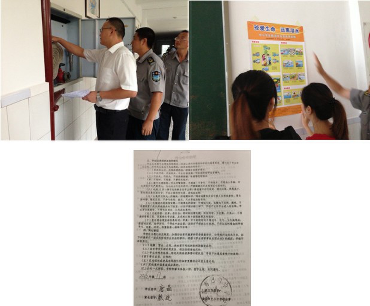 为了确保师生返校后的安全,8月25、30日,我校组织德育干部、职员、保安和生活老师进行了校园安全大检查,及时排除了安全隐患;张贴了防溺水安全宣传画,为了进一步加强安全管理,向学生家长发防溺水短信提醒,预防溺水事故发生。9月2日向全校学生印发了《安全公约》,做好家校结合确保学生平安健康成长。在9月4日组织学生进行了开学法制安全教育,观看交通安全、消防安全、防踩踏、防溺水的视频资料。从本期开学至今,我校先后接受三次相关职能部门的安全检查,均获得较高评价。