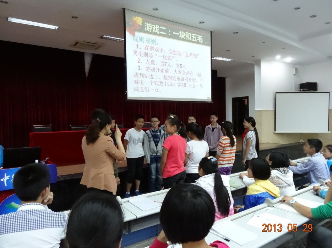 5月29日下午,在各班初赛的基础上各派4名学生代表齐聚阶梯教室,我们以《幸福拍手歌》热身全场后,“一元,五毛”的团辅活动告诉同学们要正确处理男女生的关系,然后分别以个人和班级展开了心理健康知识决赛,同学们积极参与,也表现出不凡的知识功底。