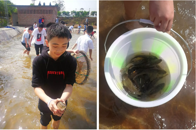 感谢天公作美,阳光将河水烘烤得暖洋洋的,同学们得以下河摸鱼,体验原滋原味的田园生活。