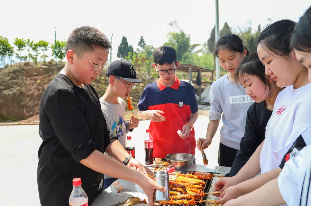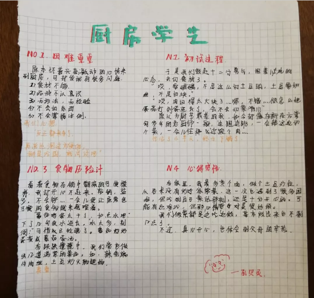 回到学校,厨房小组的同学们对操作过程进行了总结复盘。经此一行,上面这位原本只会泡泡面、做沙拉的娃儿,看来也有望变身“新东方大厨”了。