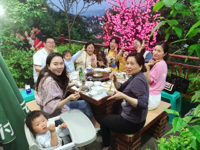 ▲ 晚上,父子、母女、师生枇杷树下聚餐畅聊。