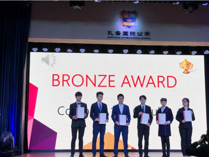 而在今年的ASDAN模拟商赛(成都孔裔商赛)中,2019届的王俊杰、叶曜荣、陈妍岑,2020届的梁皓南,2021届的黄莉媛和胡盛铜几位同学模拟创立的C cube公司最终摘取Bronze Award,并分别在拍卖环节和企业展示中获得Best Trading Team和第一名的成绩。
