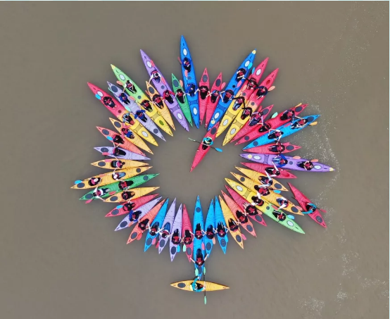 皮划艇接龙比赛中,甚至还有一条鱼跳进了谭皓峰的皮划艇。