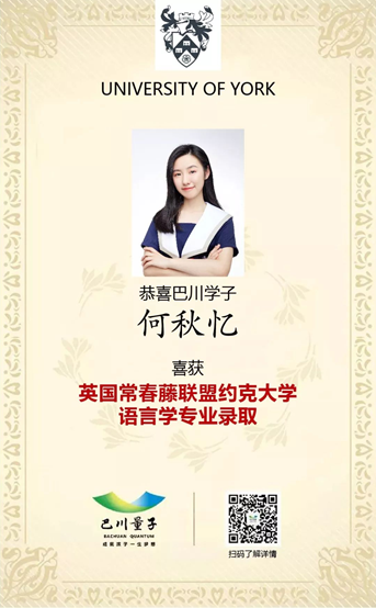 巴川量子国际精英班2020级学生何秋忆喜获英国约克大学语言学专业录取通知书,这也是本届高三学生的第一封录取通知书!
