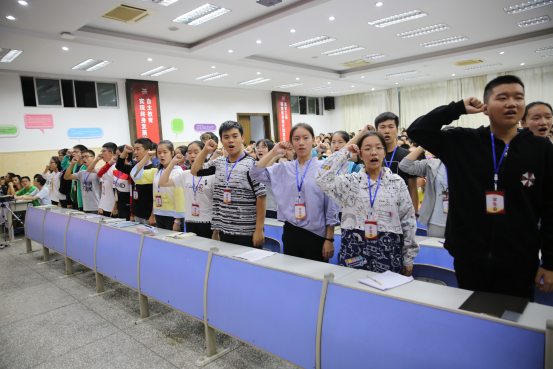 当日,先由学校领导公布学生会名单,在场的每位同学都真诚祝贺干部们,掌声经久不息。再有学生会主席发表就职演讲,其词鼓舞人心,感情真挚动人,点燃了全场。之后全体学生会成员宣誓,一字一句,情真意切,让我们感受到了他们为同学们服务的决心,为学校的管理付出努力的决心。之后,校领导为学生会成员颁发了工作证,至此,各位学生会成员真正接受了使命,成为学校管理者的一员,成为学生代表学生会的一员!他们将带着自己的使命在学生会开启他们的新航程。之后,新老学生会成员及老师集体合影留念。为这值得纪念的一天留下了回忆。