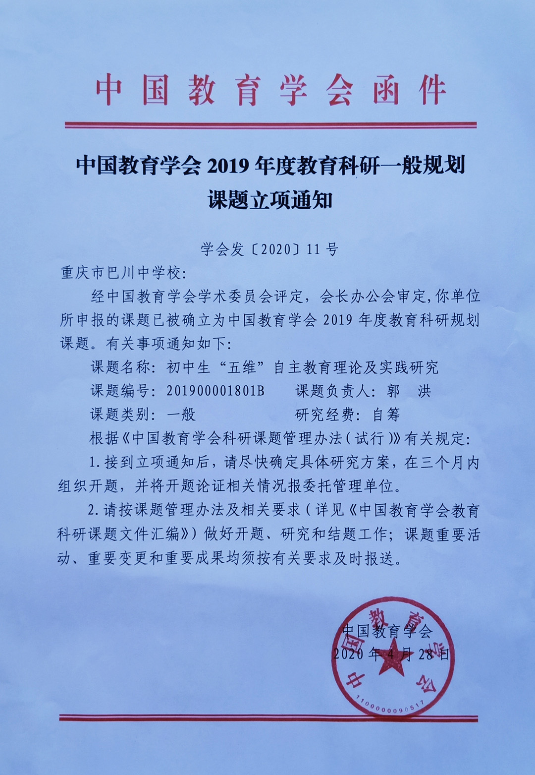 中国教育学会2019年立项证书:初中生“五维”自主教育理论建构与实践研究