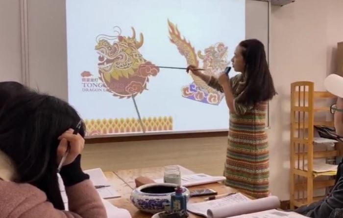 探访铜梁龙非遗传承人是探索铜梁龙艺术造型特征的一个重要途径。学校邀请非遗传承人曹胜琼入校教学——曹胜琼带着一大包材料来到学校,从捻纸、绕圈、上嘴线、鼻洞、唇腮线等方面开展教学。当铜梁龙的形象在曹胜琼手上逐渐成形,师生对铜梁龙的造型特色有了更深入的了解。