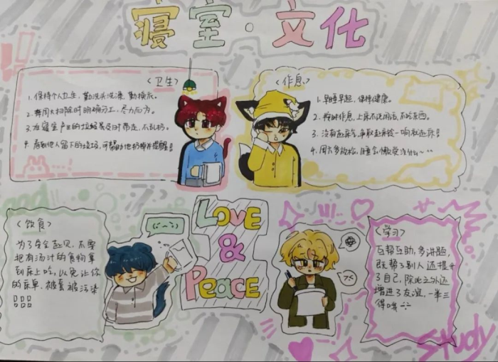 内务管理,地面、墙面、桌面、床面、窗台面、洗手台面“六面光”,豆腐块被子、鞋子、箱子、毛巾、漱口杯、牙刷牙膏、水桶、书柜“八条线”;不仅严格遵守《住校生管理条例》,还会以寝室为单位制定宿舍公约共同遵守;当然,还有百花齐放的寝室文化,同学们根据各自寝室的特点,打造出各式各样的特色寝室······