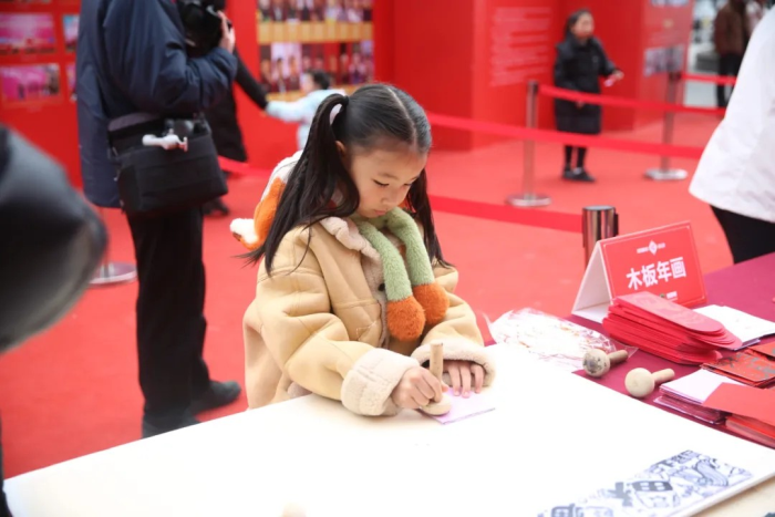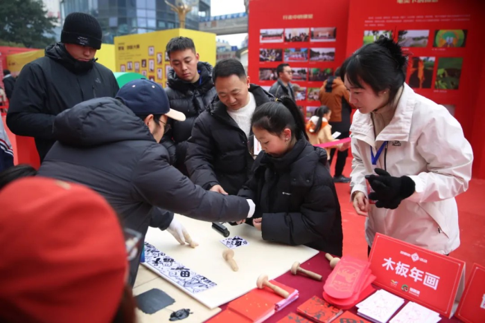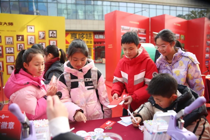 体验区里,刻刀在雪弗板上轻轻划动,一幅幅版画逐渐成形;糖画勺流转之间,巴川各学部的吉祥物跃然而出。剪纸、徽章制作、明信片拓印与套色印章……每个体验台前,都有孩子与家长俯身尝试。