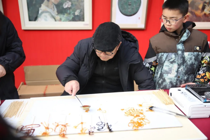 这场景还吸引了同城的非遗糖画师傅驻足。这位老师傅自然地接过糖勺,亲手画了几幅。一递一接间,是技艺与创意自然而然的吸引,是校园的美育实践与街头非遗传承的连接、延伸。