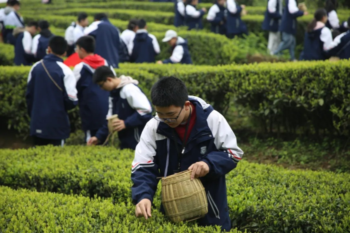 茶园里,孩子们弯腰采茶,指尖轻捻“一芽一叶”,在春光中感受劳动的节奏;